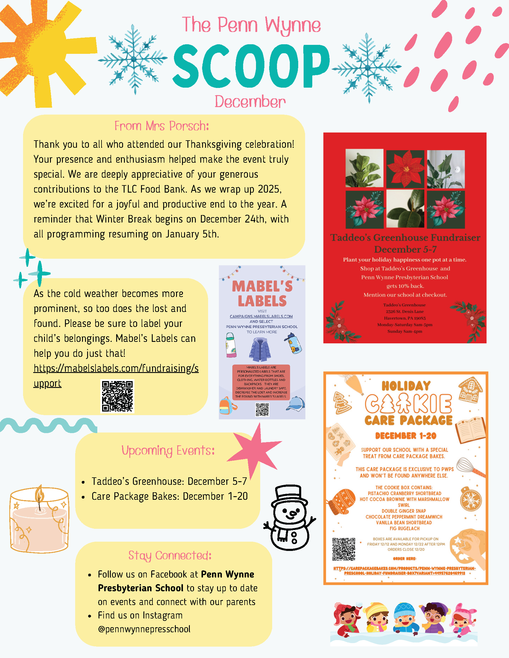 Thank you to all who attended our Thanksgiving celebration! Your presence and enthusiasm helped make the event truly special. We are deeply appreciative of your generous contributions to the TLC Food Bank. As we wrap up 2025, we’re excited for a joyful and productive end to the year. A reminder that Winter Break begins on December 24th, with all programming resuming on January 5th.